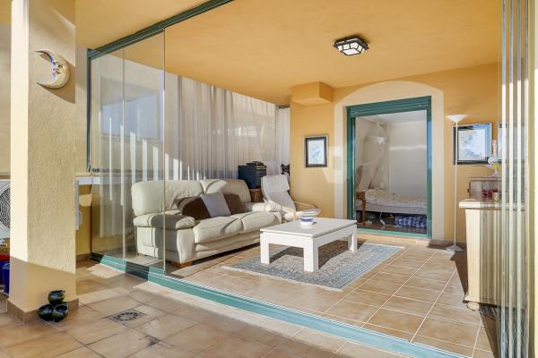 Las vistas son encantadoras: vistas panorámicas al campo de golf y al mar. ¡Simplemente impresionantes! El apartamento tiene una superficie habitable de 80 m² y una amplia terraza (30 m²) parcialmente cerrada con mamparas correderas de cristal que crean un invernadero.